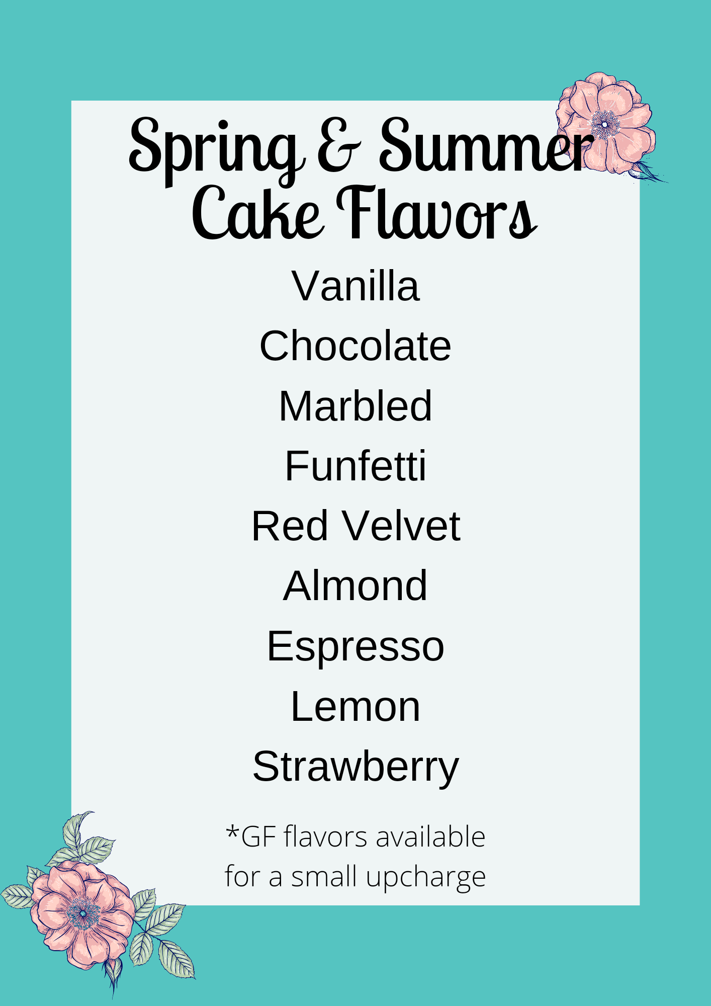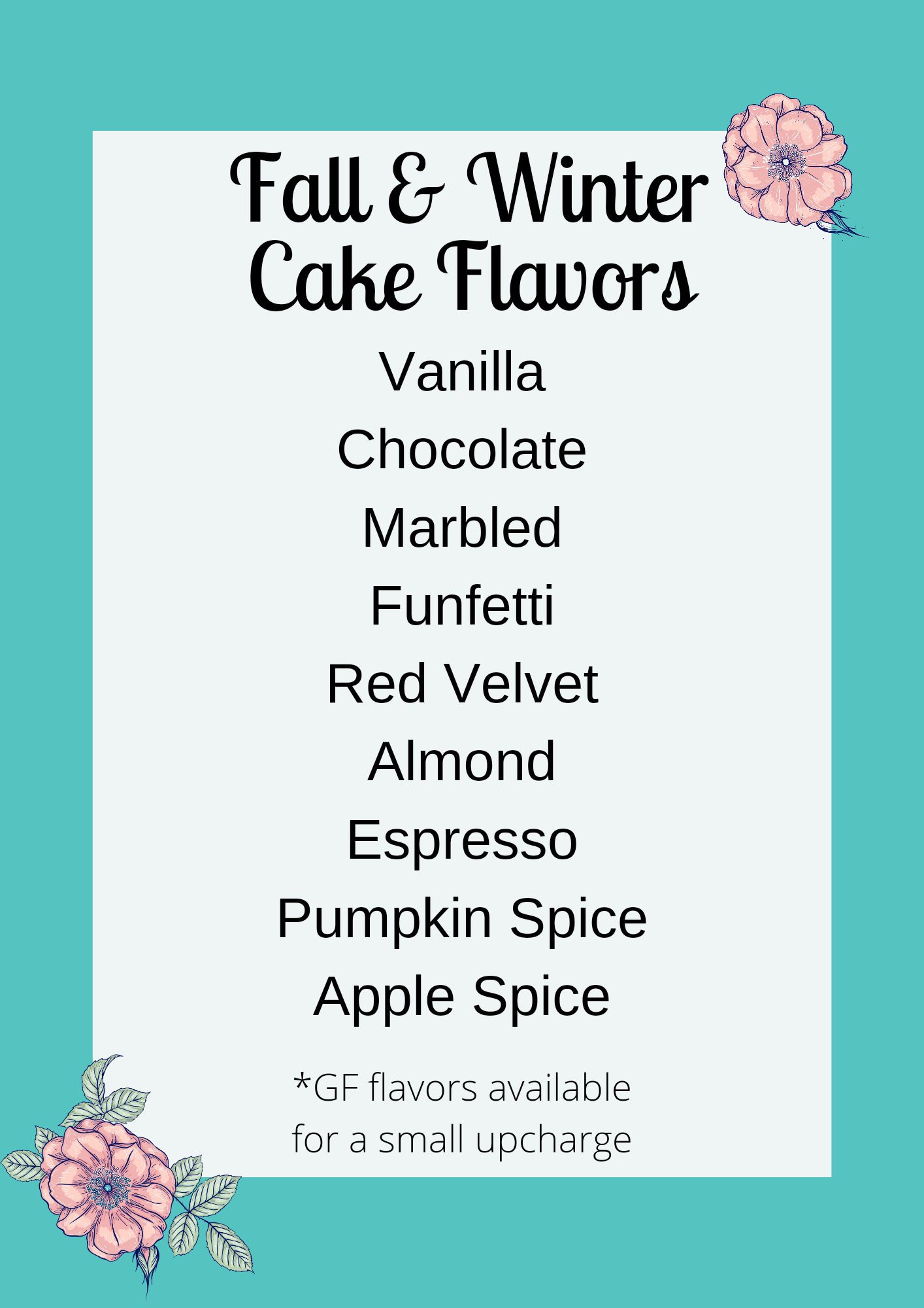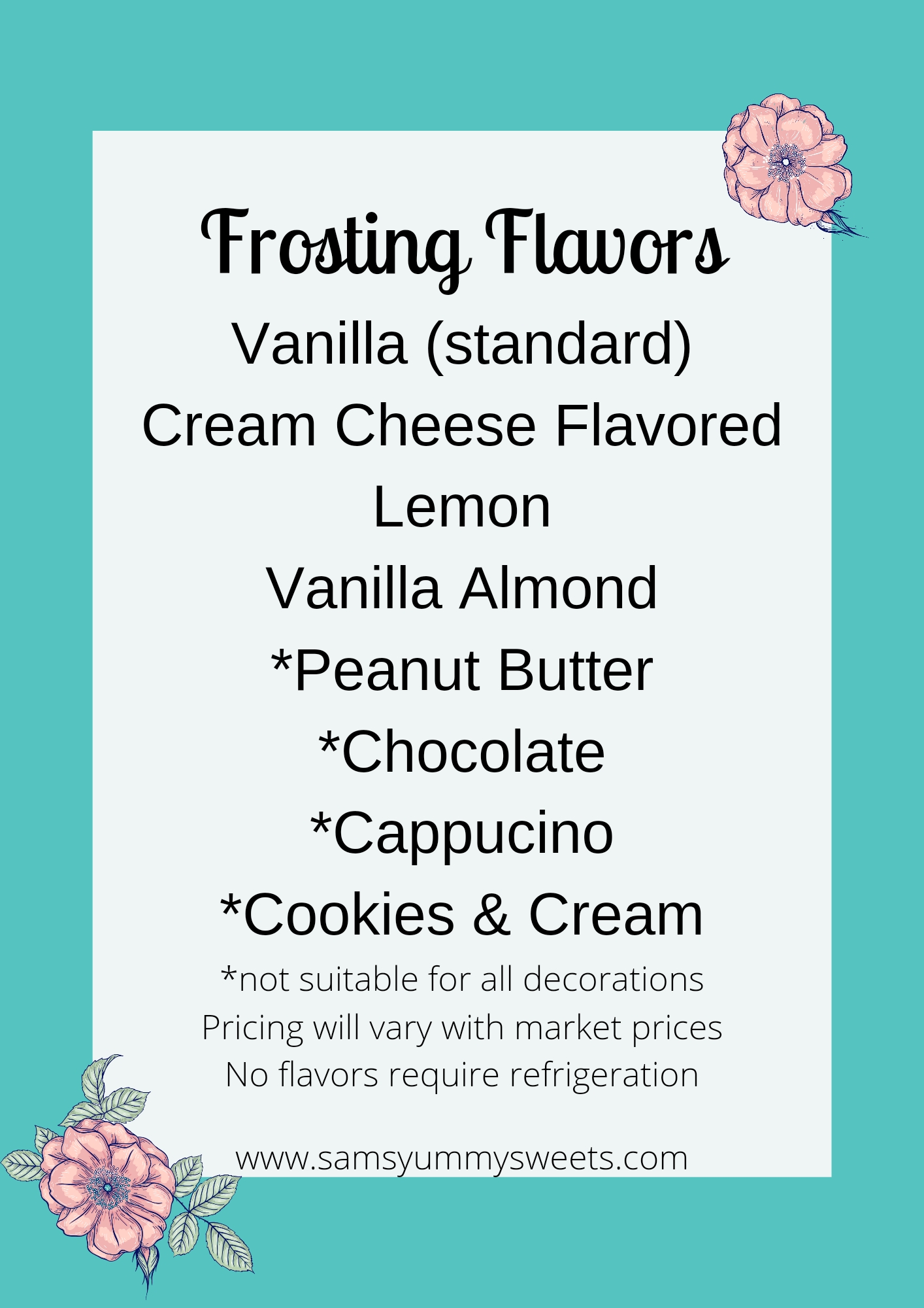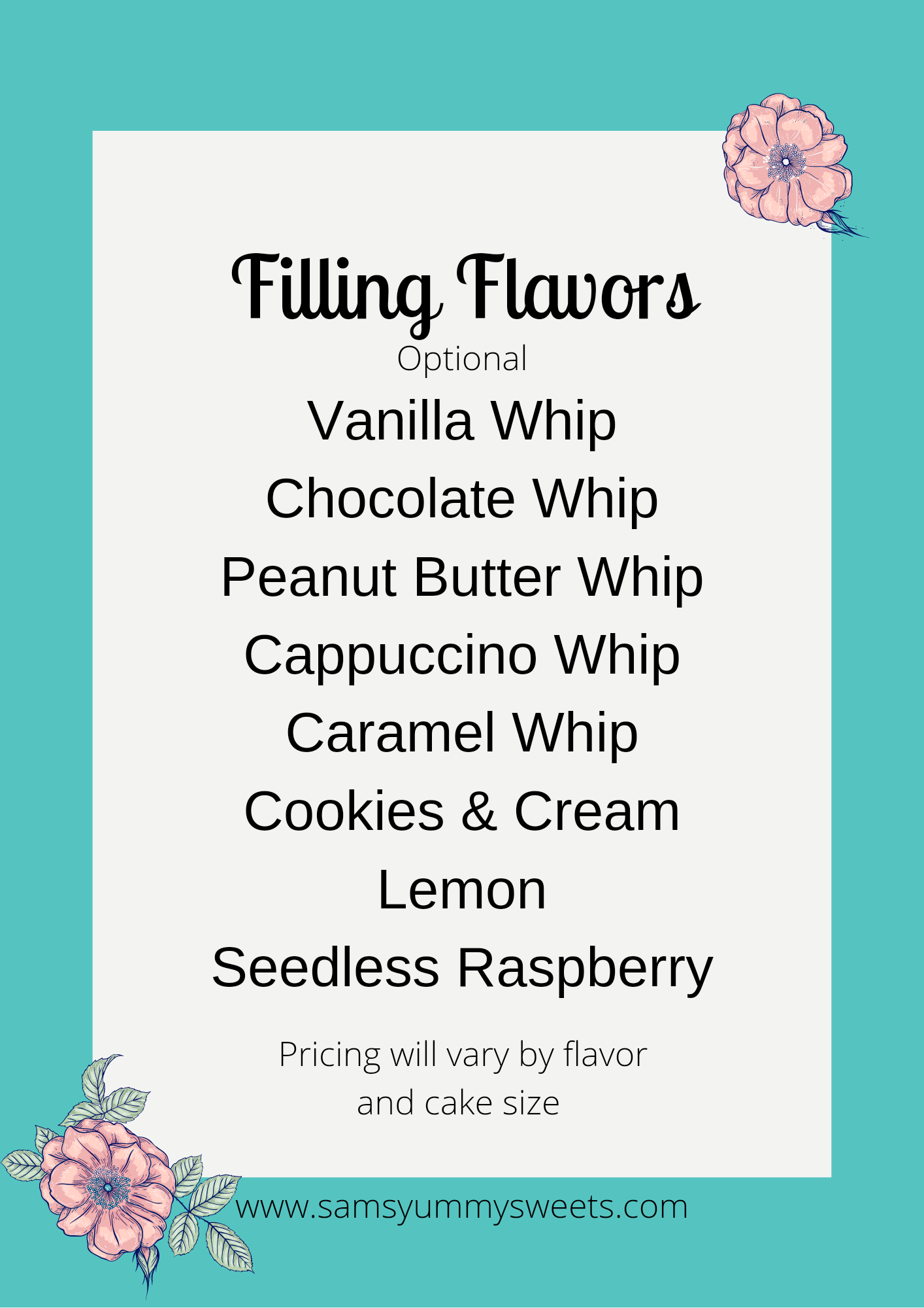 As a custom home bakery, I offer 11 different flavors of cake with a variety of delicious filling options and buttercream frosting flavors. I use high quality ingredients and flavorings to give you consistent results. Whipped fillings are thinned out, fluffier versions of my regular buttercream flavors. Under Ohio’s Cottage food laws, I am not permitted to sell cakes with whipped cream as an icing, or any other foods that must be refrigerated.