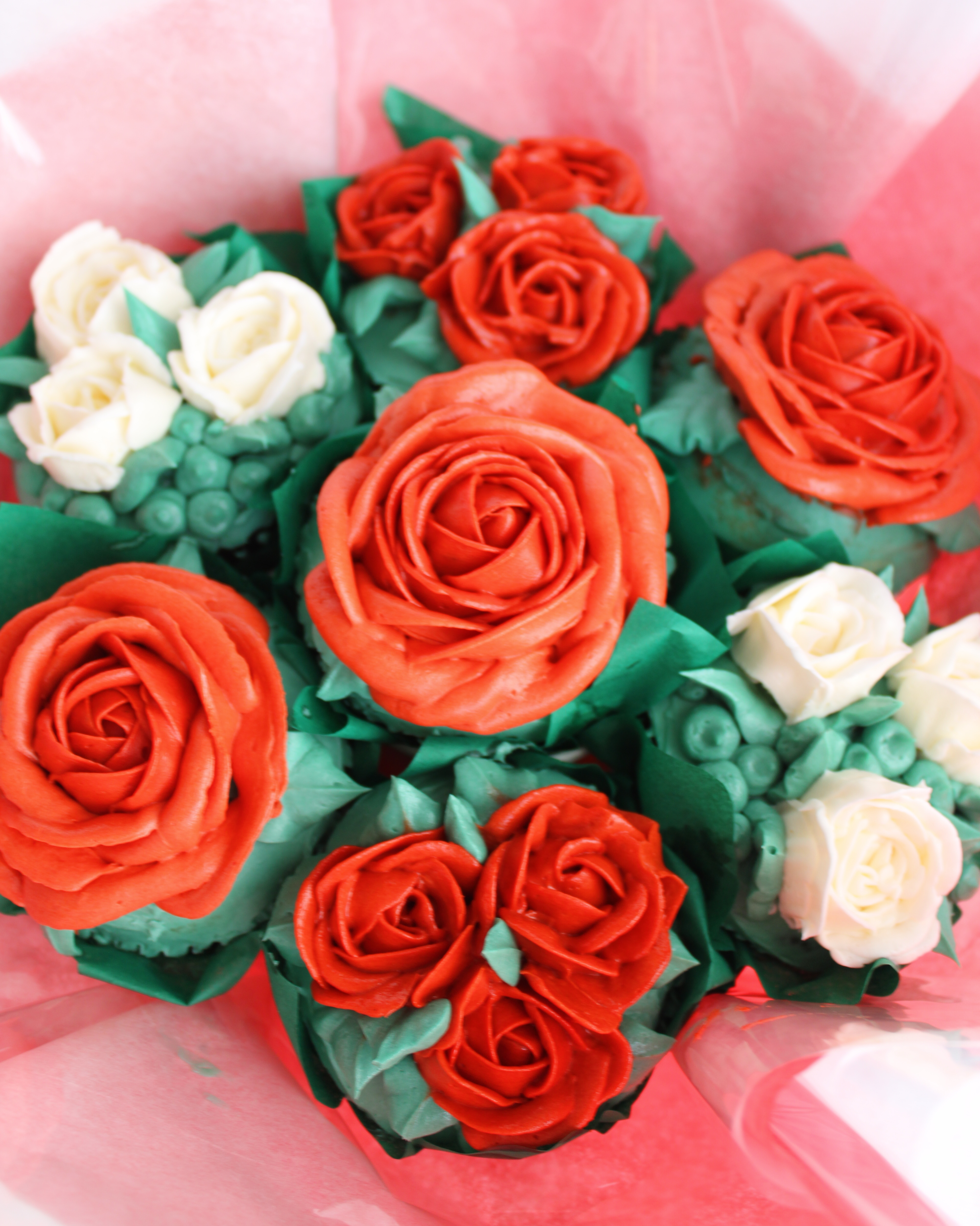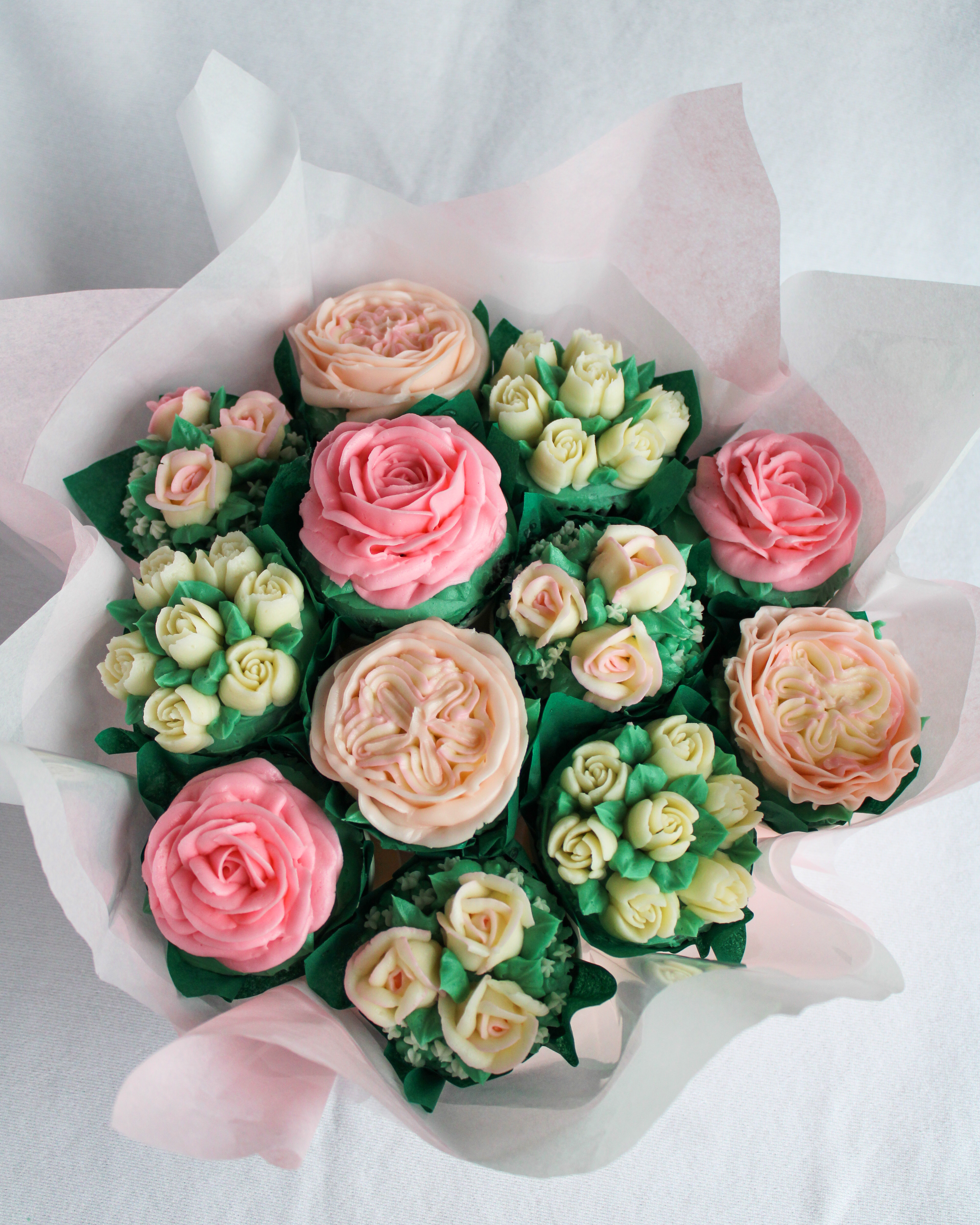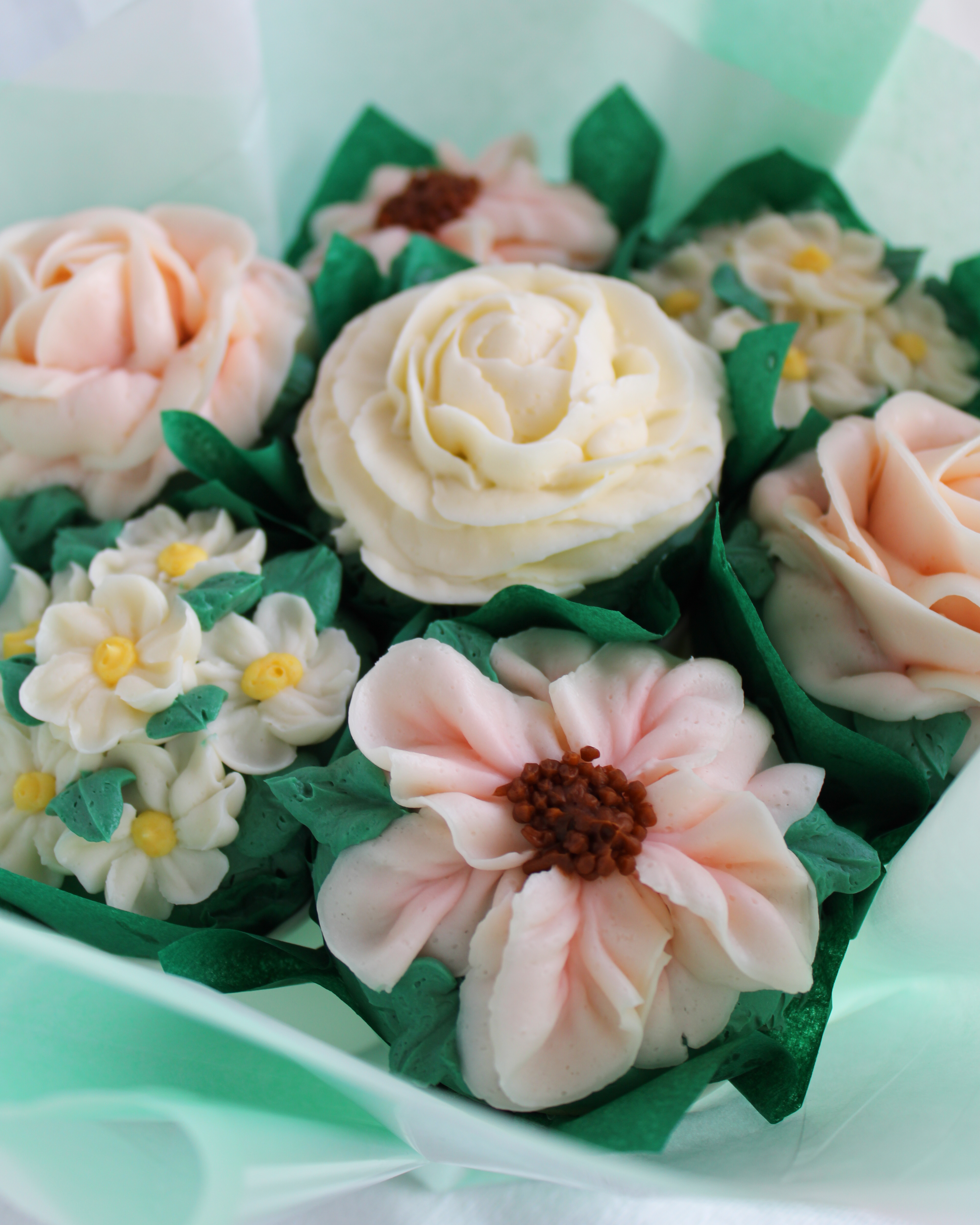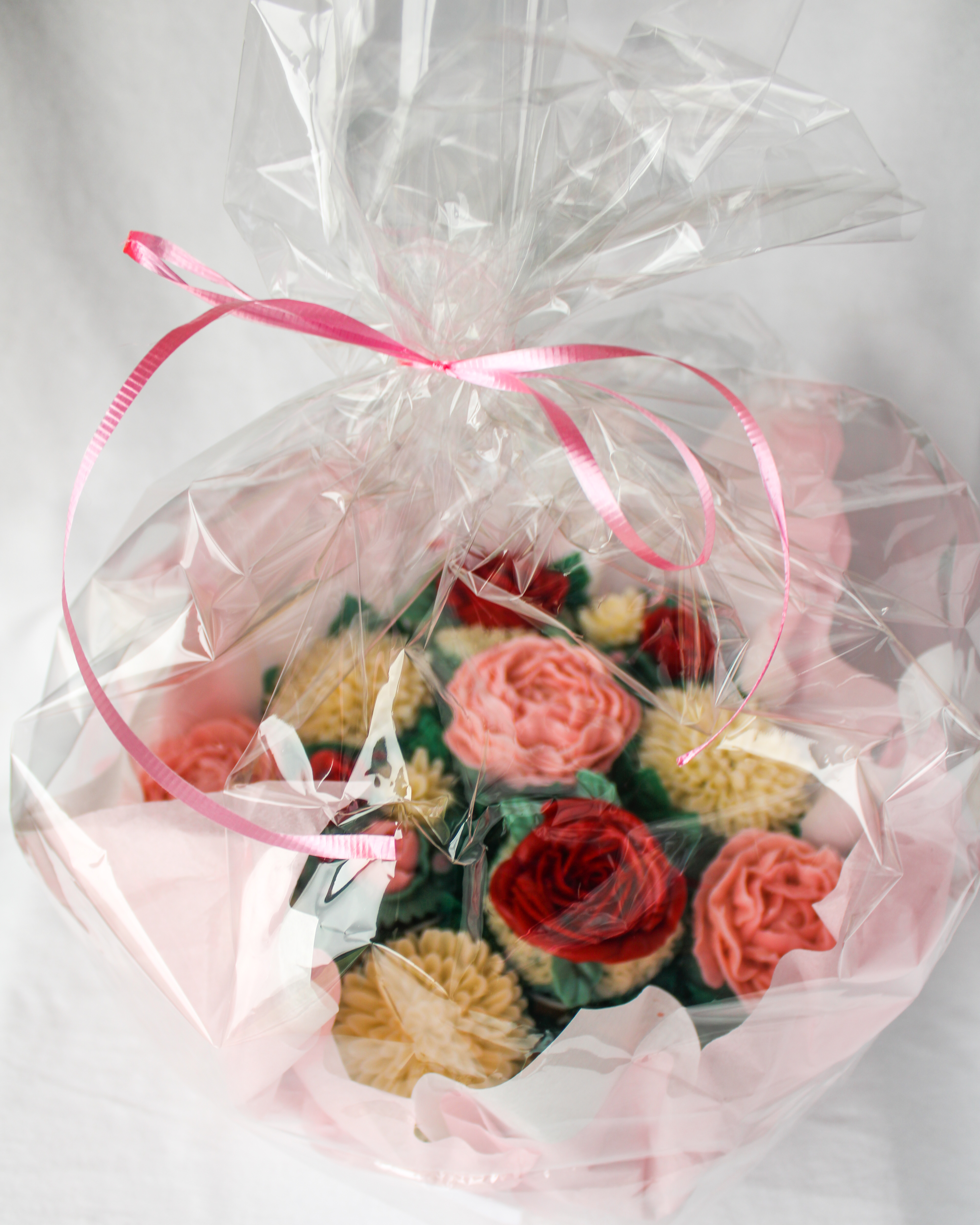 7-19 cupcakes, decorated with rosettes or with my Deluxe Flowers, arranged in a form, and wrapped for easy gifting