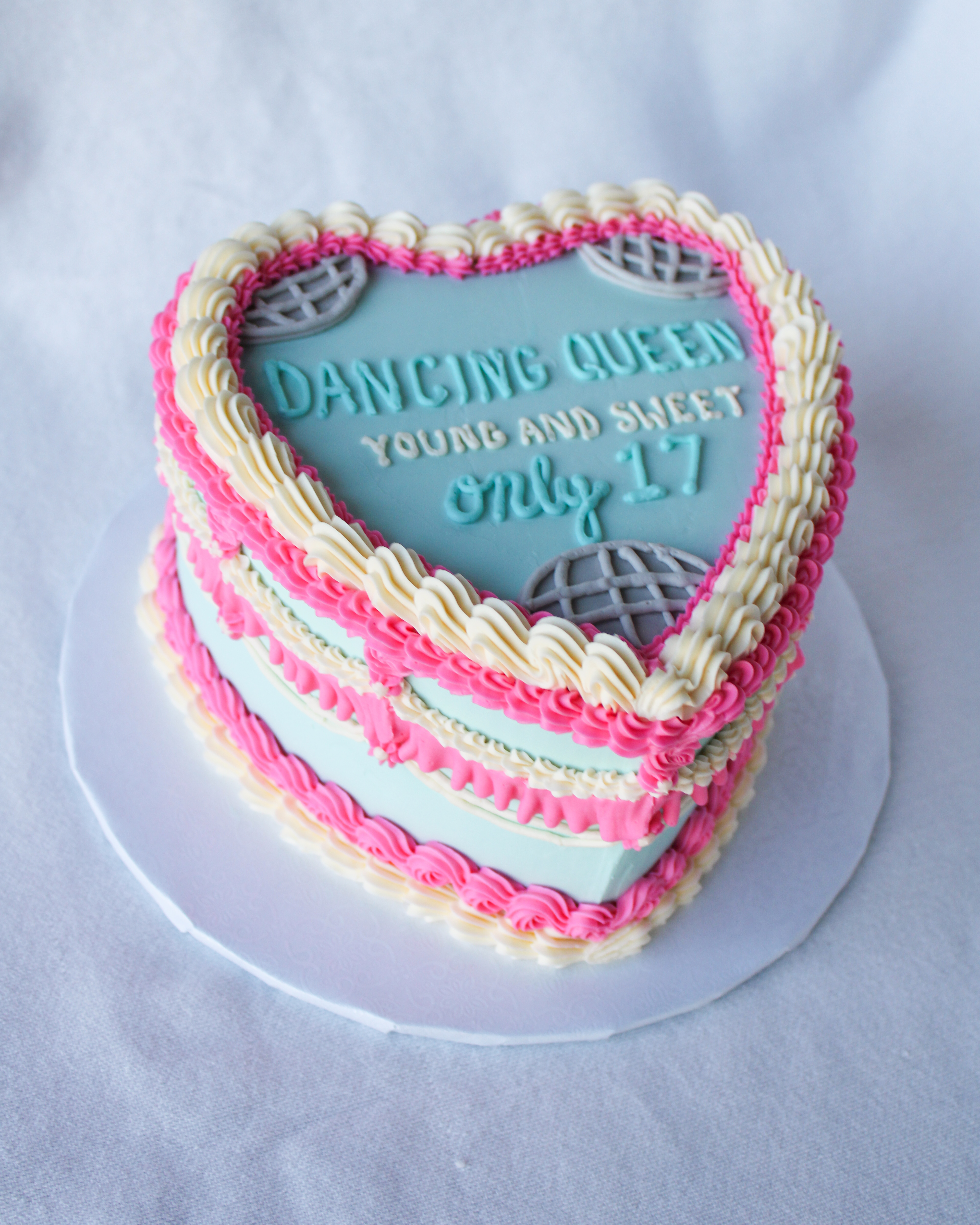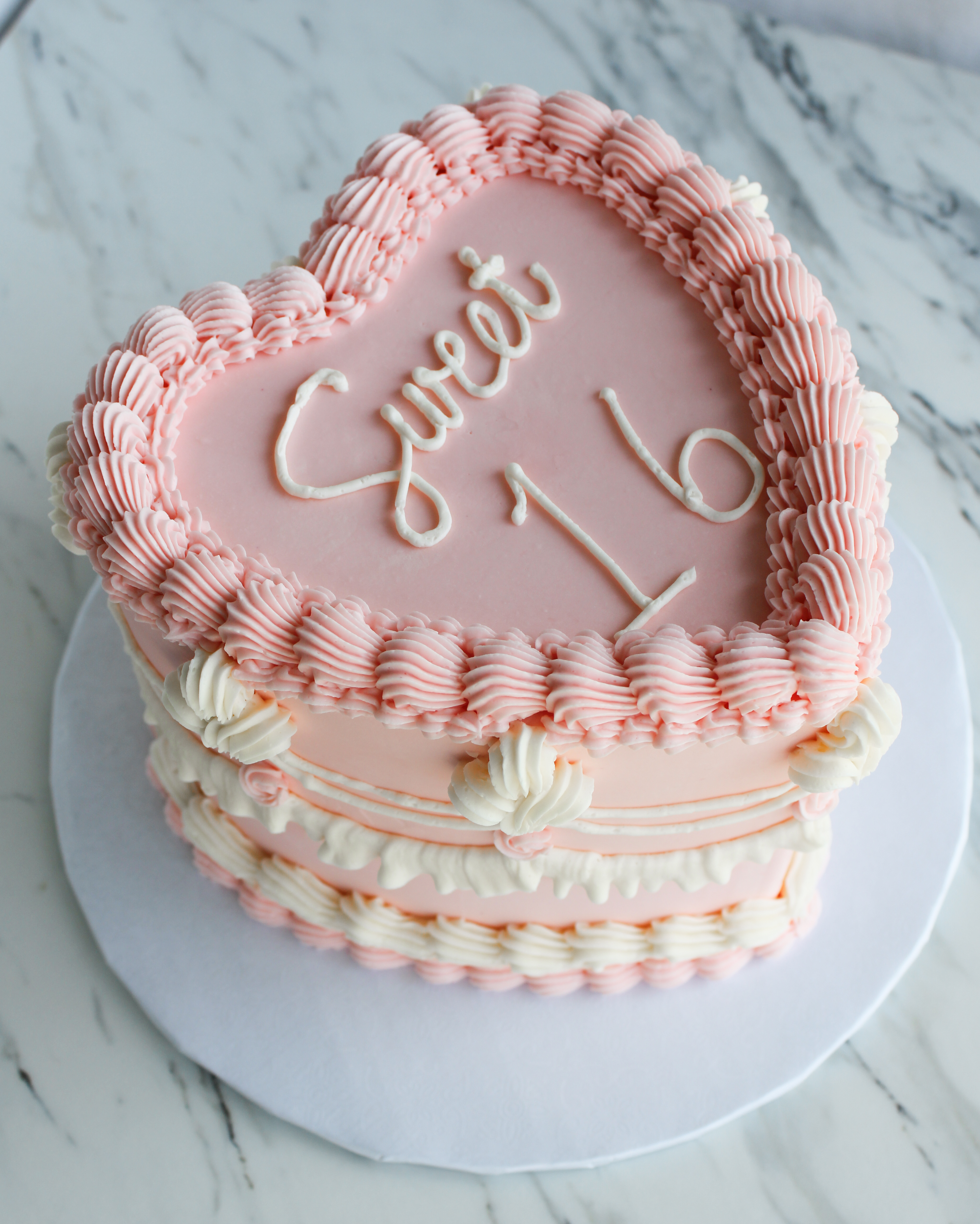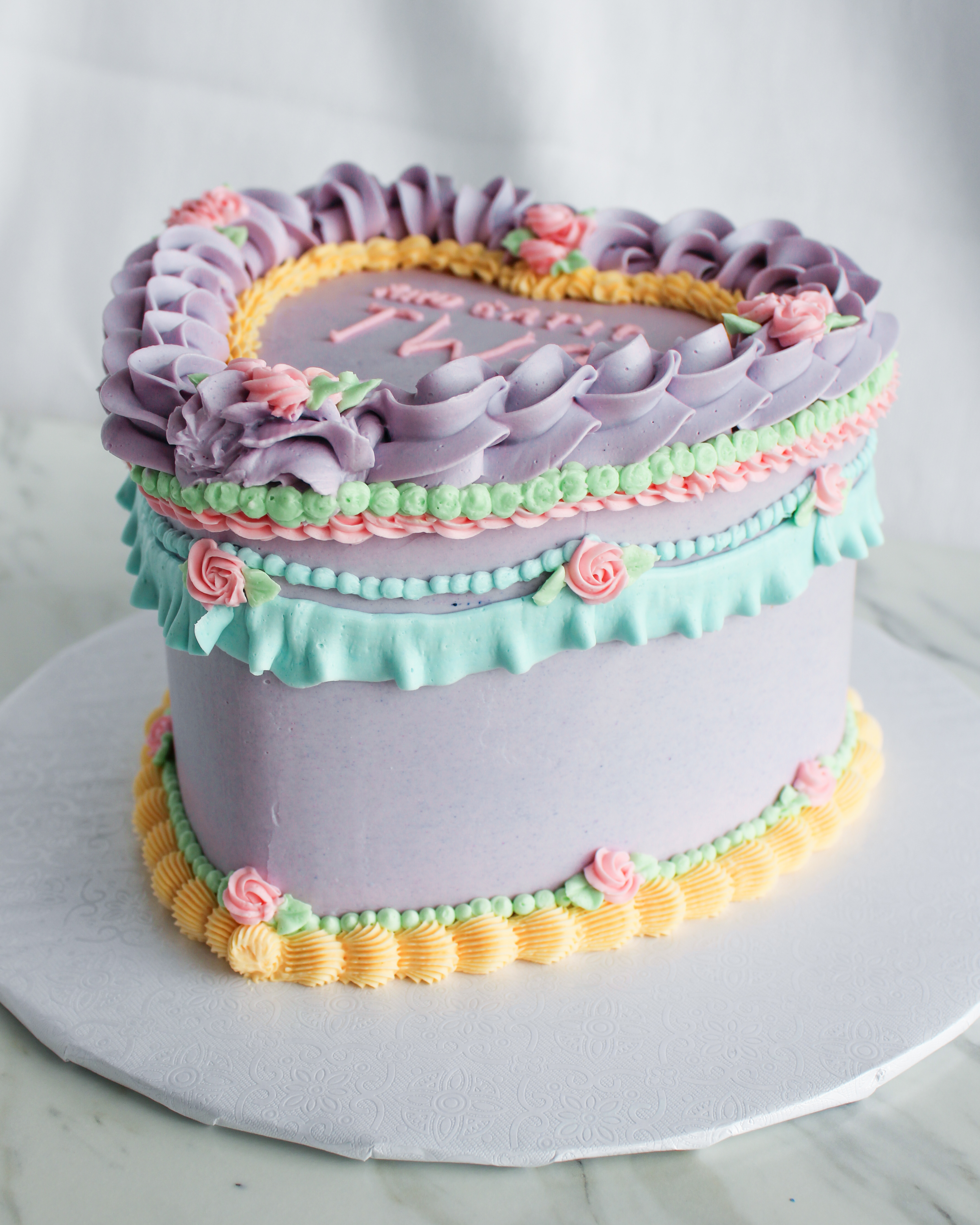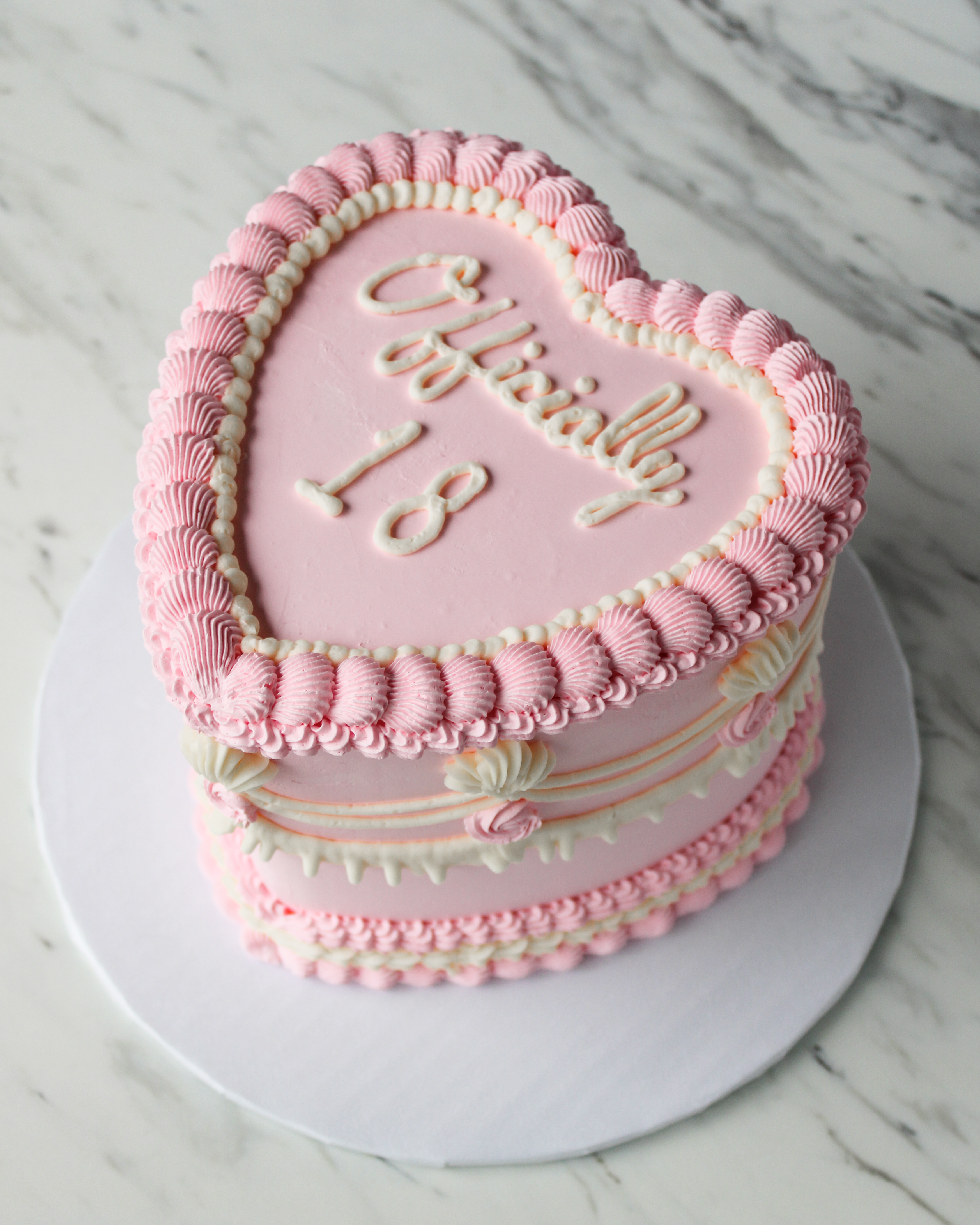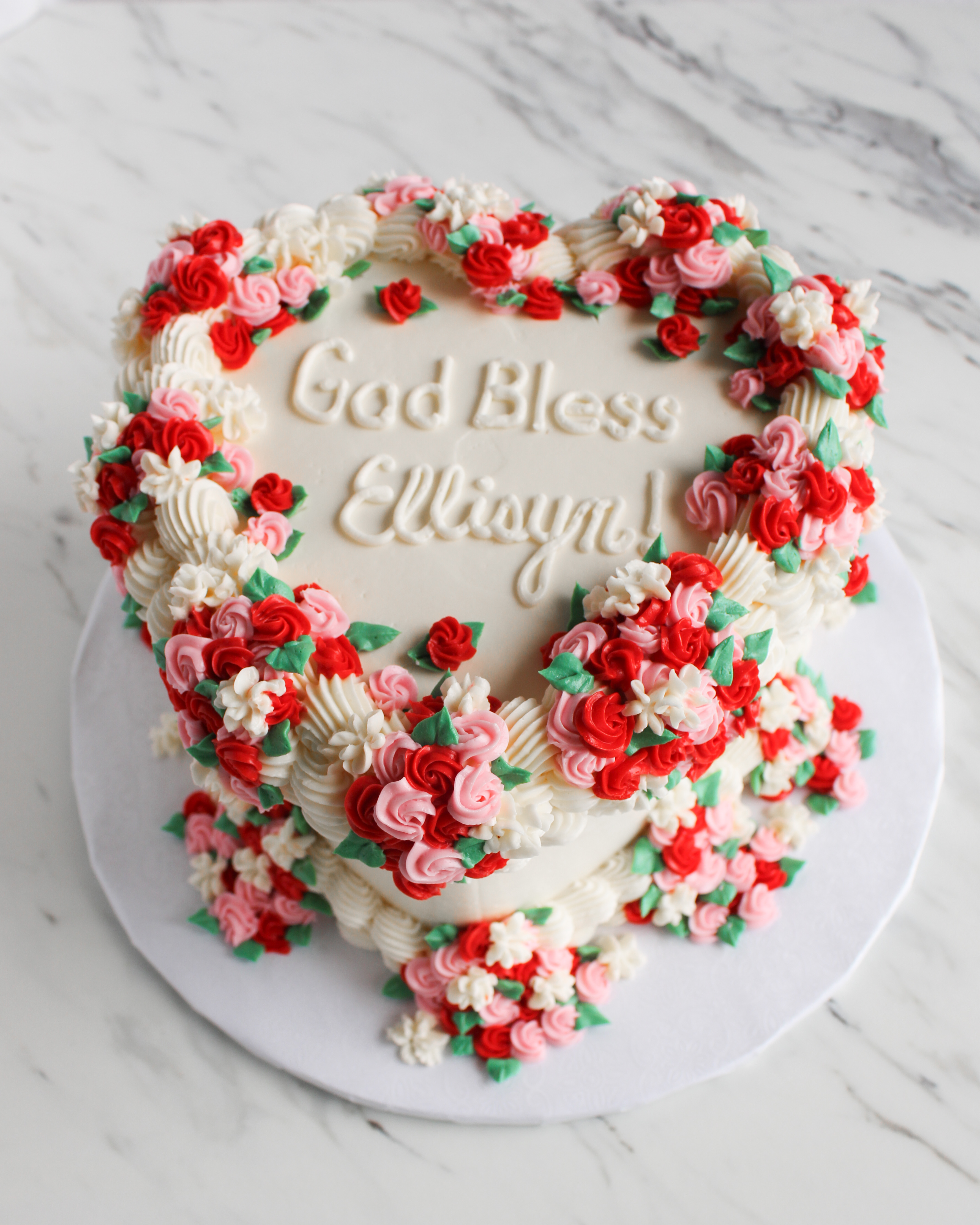 6″ heart cakes decorated with ruffles and bows, flowers, or other designs